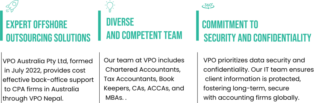 VPO Australia Pty Ltd, established in July 2022, provides back-office support to CPA firms and businesses in Australia through its subsidiary, VPO Nepal Private Limited. Founded in Kathmandu, Nepal, VPO delivers high-quality, cost-effective offshore outsourcing solutions. Our team consists of Chartered Accountants, Tax Accountants, and Bookkeepers, including CAs, ACCAs, and MBAs, ensuring top-notch service. We pride ourselves on our diverse and skilled team, a seamless transition process for clients, and robust IT systems that prioritize data security and confidentiality.